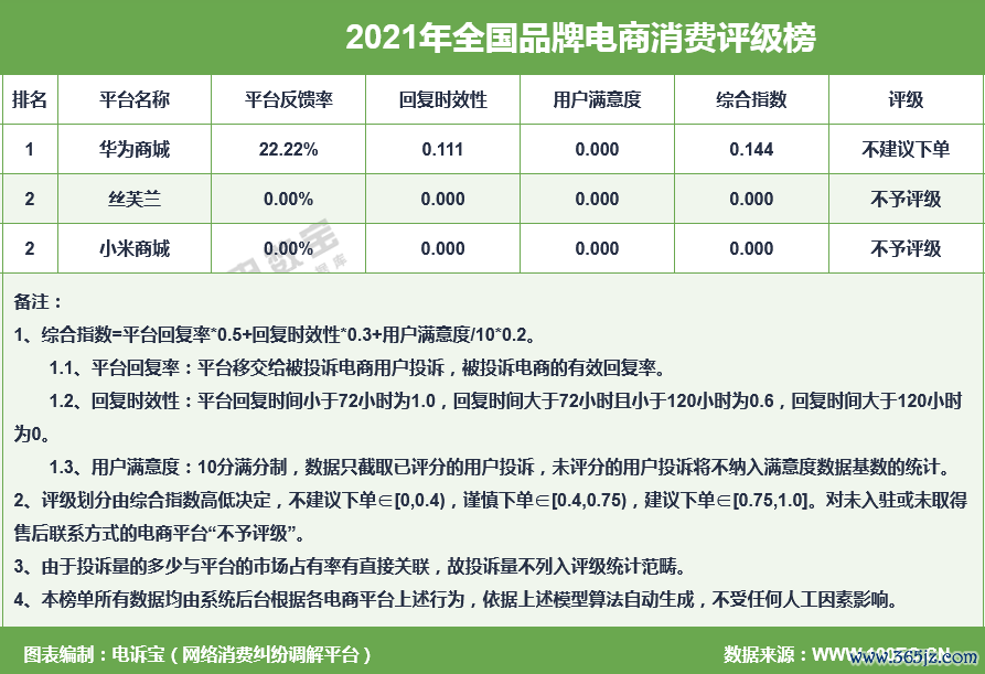 其中,华为商城获“不提出下单”评级;丝芙兰、小米商城获“不予评级”。