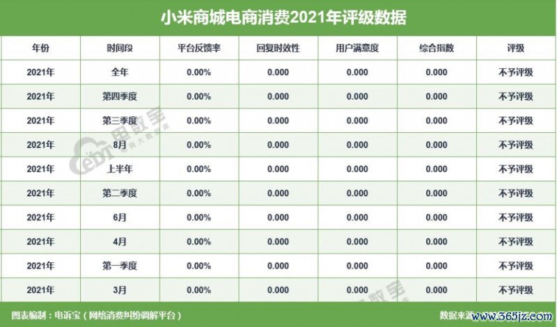 2021年“小米商城”共得回10次耗尽评级,均获“不予评级”。同期,“小米商城”存在退款问题、发货问题、售后干事、调遣货难、霸王条目的问题。