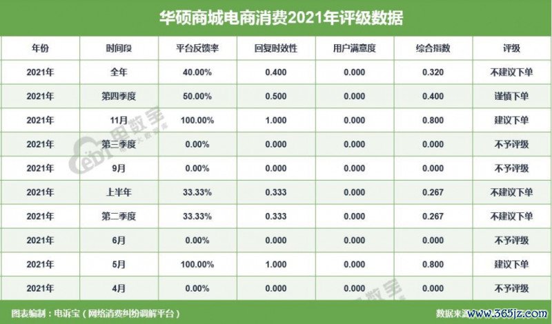 2021年“华硕商城”共得回10次耗尽评级, 3次获“不提出下单”评级、1次获“严慎下单”评级、4次获“不予评级”、2次获“提出下单”评级,最终获“不提出下单”评级。同期,“华硕商城”存在退款问题、调遣货难、出票不足时的问题。
