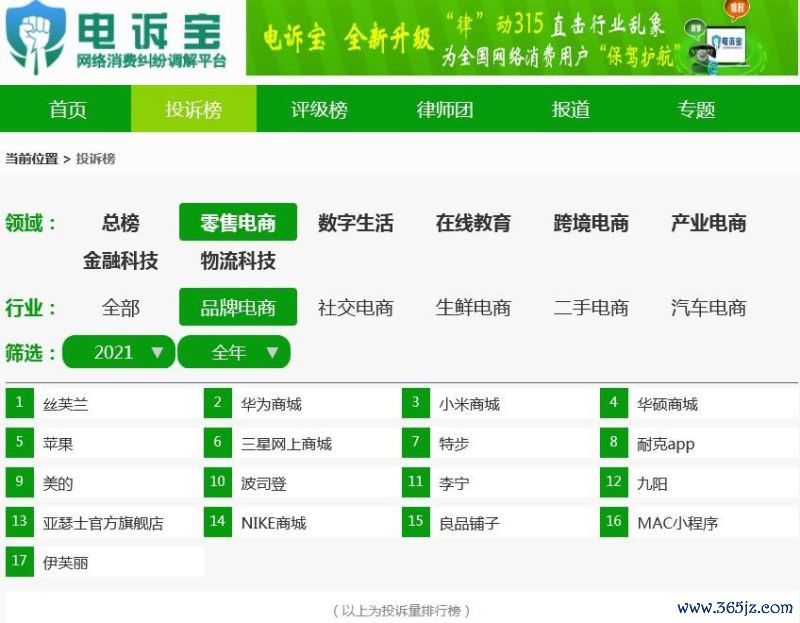 据“电诉宝”2021年受理的品牌电商规模用户有用投诉表现,入选投诉榜顺序为丝芙兰、华为商城、小米商城、华硕商城、苹果、三星网上商城、特步、耐克APP、好意思的、波司登、李宁、九阳、亚瑟士官方旗舰店、NIKE商城、良品铺子、MAC小瑕玷、伊芙丽。