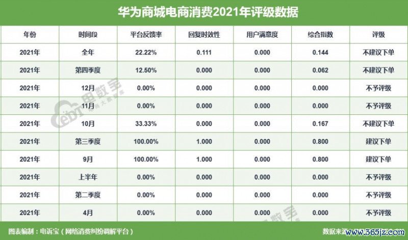2021年“华为商城”共得回10次耗尽评级,其中,3次获“不提出下单”评级、5次获“不予评级”评级、2次获“提出下单”评级,最终获“不提出下单”评级。同期,“华为商城”存在退款问题、发货问题等问题。